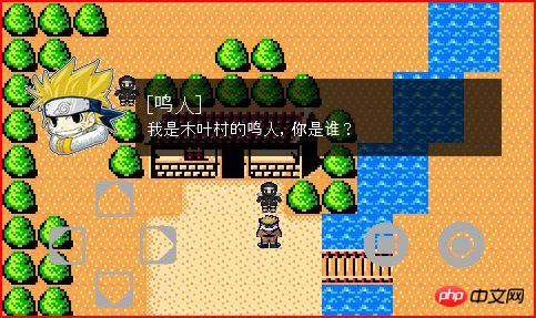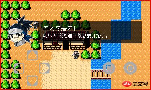 添加对话时的做法是,当点击方形按钮后,判断小鸣人前方是否有人,如果有人,则将这个人物的编号取出来,再从上面的数组中获取相应的对话内容,然后,将相应的内容显示到游戏屏幕上,具体实现代码如下
