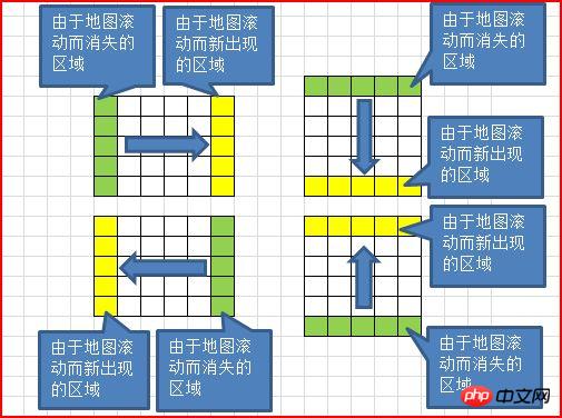 按照上图说明,实现地图滚动,只需要先把即将出现的地图(图中黄色部分)画上,然后滚动地图,待地图滚动完毕之后,将屏幕之外的部分(图中绿色部分)移除