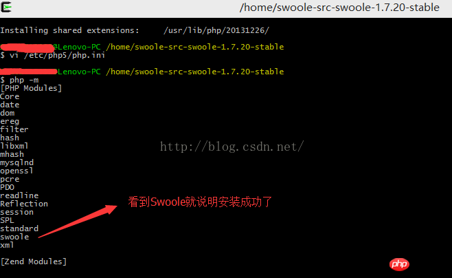 9 使用命令:php -m,查看加载的模块,如果看到swoole,则扩展添加成功,到此环境搭建成功!