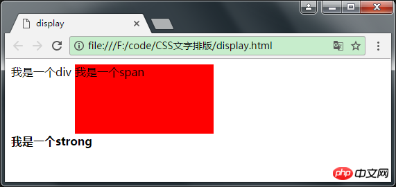 1 <style type="text/css">2 strong {3 display: block;4 }5 6 div {7 display: inline;8 }9 </style>可以看到div标签与span在同一行显示了