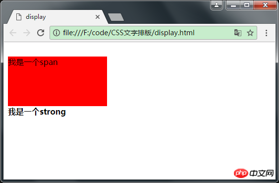 1 <!DOCTYPE html> 2 <html lang="en"> 3 <head> 4 <meta charset="UTF-8"> 5 <title>display</title> 6 7 <style type="text/css"> 8 strong { 9 display: block;10 }11 </style>12 </head>13 <body>14 <div>我是一个div</div>15 <span>我是一个span</span>16 <strong>我是一个strong</strong>17 </body>18 </html>