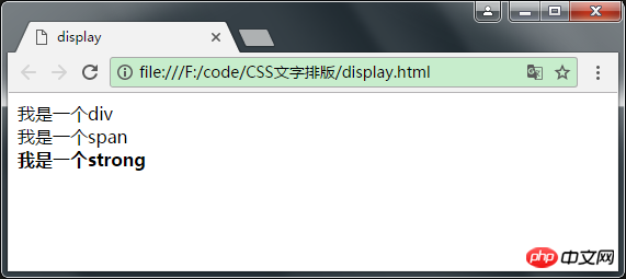 1 <!DOCTYPE html> 2 <html lang="en"> 3 <head> 4 <meta charset="UTF-8"> 5 <title>display</title> 6 </head> 7 <body> 8 <div>我是一个div</div> 9 <span>我是一个span</span>10 <strong>我是一个strong</strong>11 </body>12 </html>