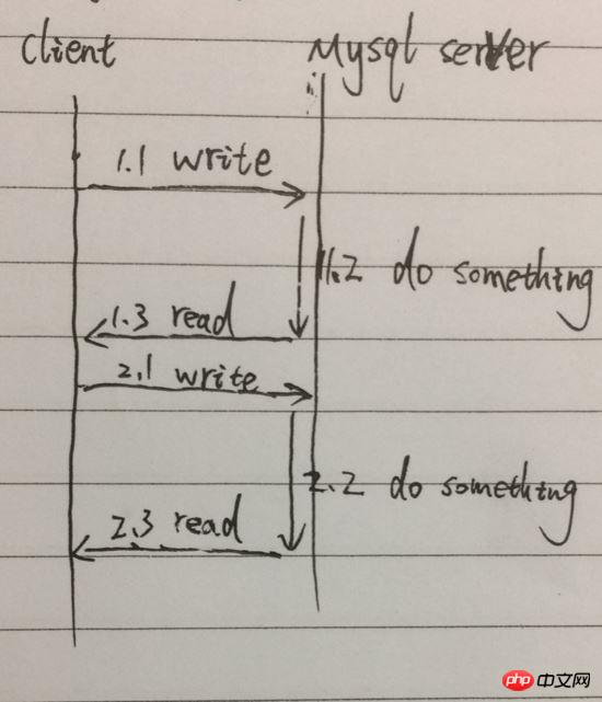 例图,由1.1到1.3为一个Query[函数]的调用,两次查询,就要串行经历1.1、1.2、1.3、2.1、2.2、2.3,尤其在1.2和2.2会阻塞等待,进程没法做其他事情。