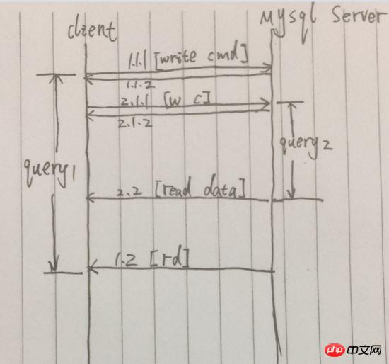 这是我们最常的调用模式,客户端调用Query[函数],发起查询命令,等待结果返回,读取结果;再发送第二条查询命令,等待结果返回,读取结果。总耗时,会是两次查询的时间之和。简化一下过程,例如下图: