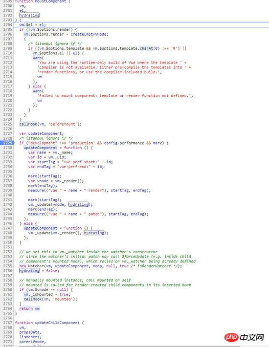 具体的将template解析成ast语法树在本文就不说了,有时间单独开一个章节分析。好,这下我们拿到render函数了,那么接下来一步干什么了呢?没错,就开始 mountComponent 了。如下图: