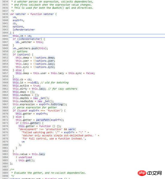 可以从上图看到,程序声明了一个 updateComponent 方法,这个是将要被 Watcher 实例调用的更新组件的方法,过一会分析到 Watcher 的时候将会看到。至于为什么会有个判断语句来根据条件声明 updateComponent 方法,其实从 performance 可以看出,其中一个方法是用来测试 render 和 update 性能的。好我们终于该到 Watcher 了,先看这句代码: