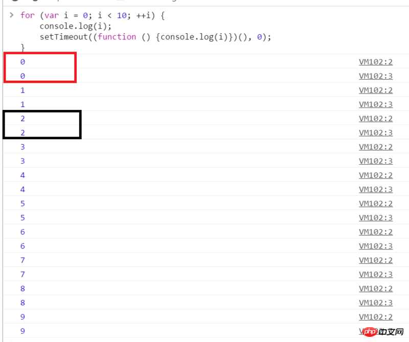 console.log(i);和setTimeout((function () {console.log(i)})(), 0);其实是在每次循环都执行掉的第一个为什么全都是 10 楼上已经回答了.