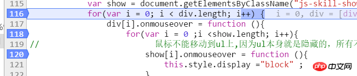 onmouseover =后面的是onmouseover的回调函数,你当前设置断点的时候只是执行了给p[i]绑定事件和回调函数,并不会关心后面的函数是什么内容,也不会去执行。只有你触发了p[i]的mouseover事件才会触发执行,才会触发118和120的断点 。