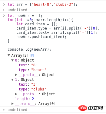 let newArr = [{type:"heart",text:"8"},{type:"clubs",text:"3"}]